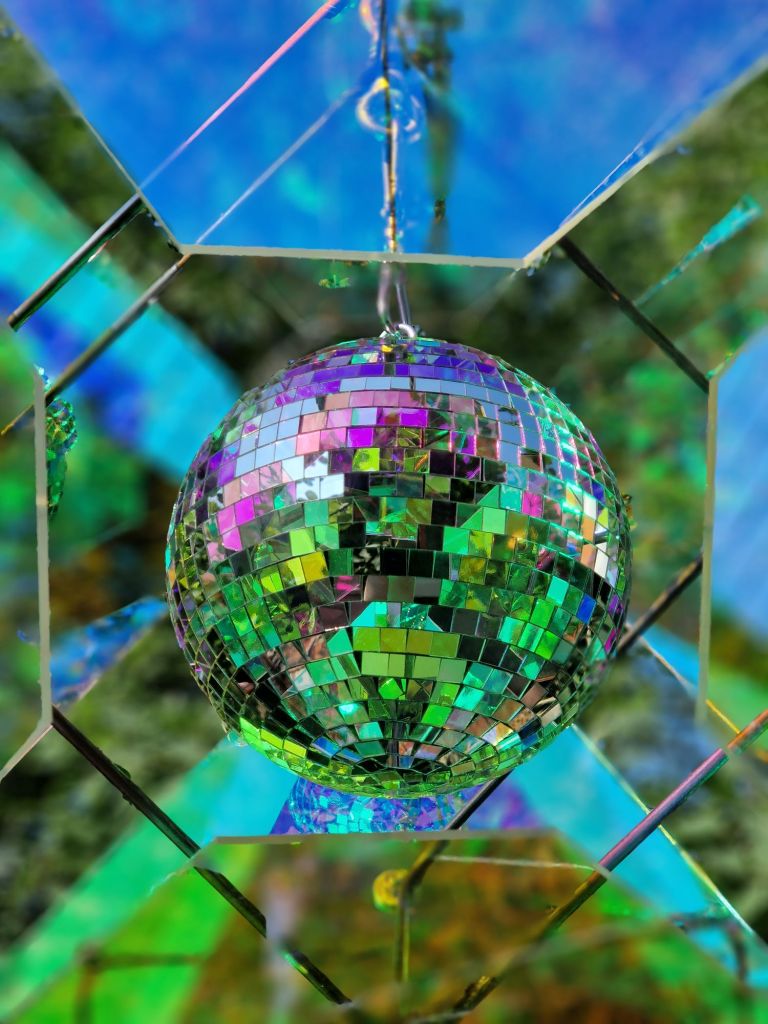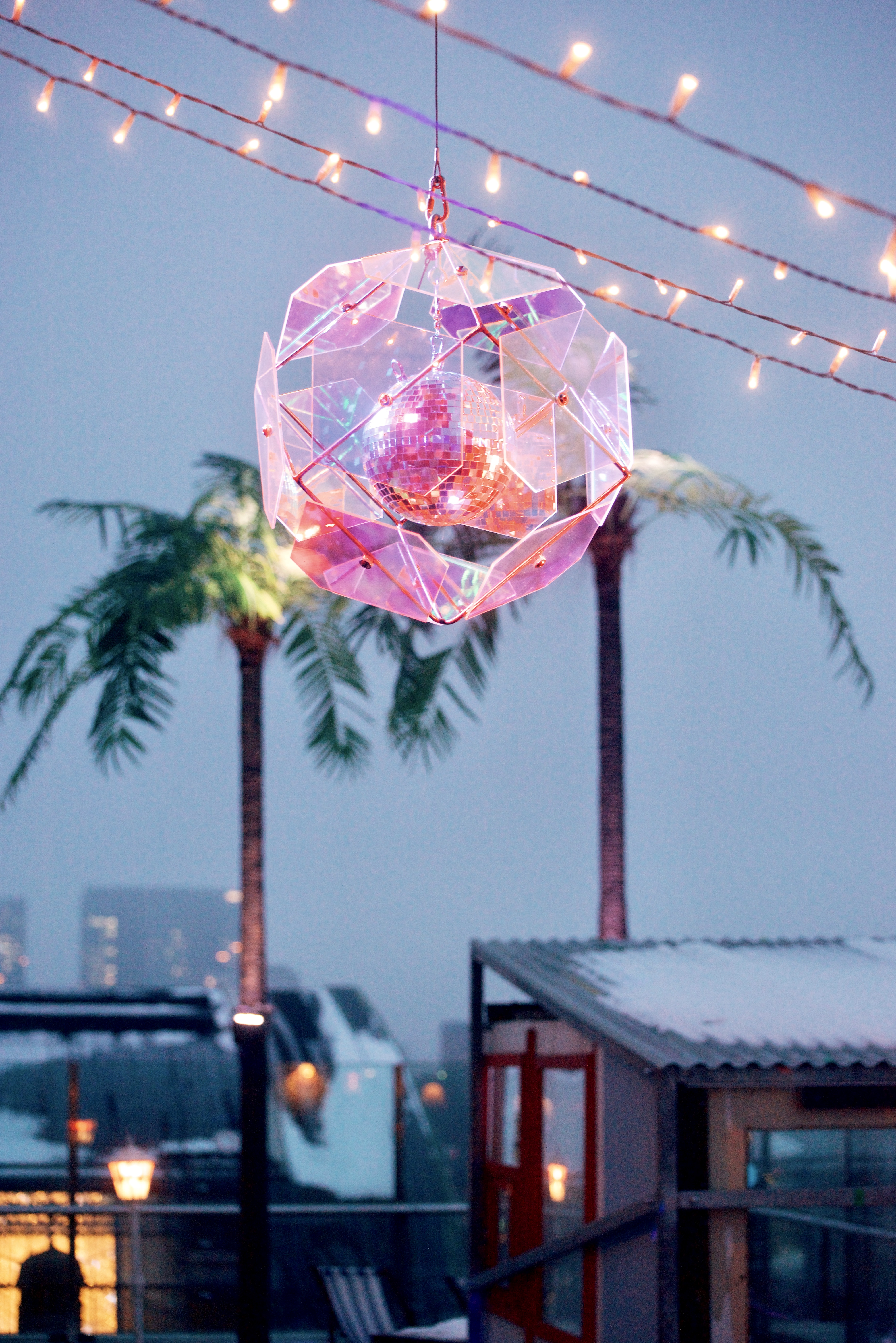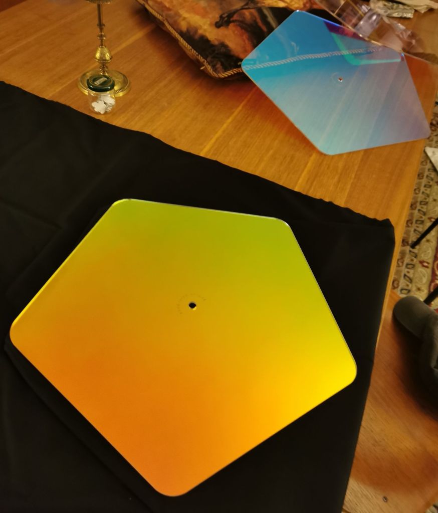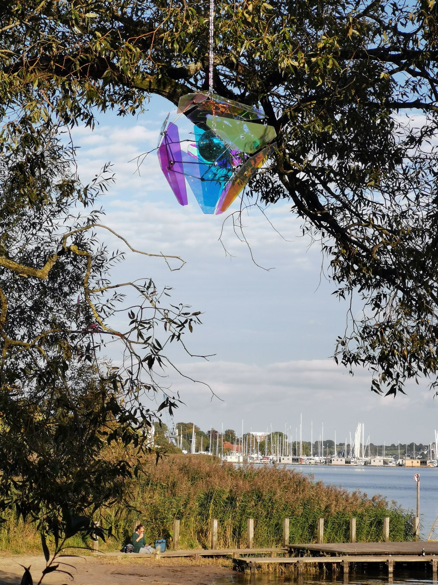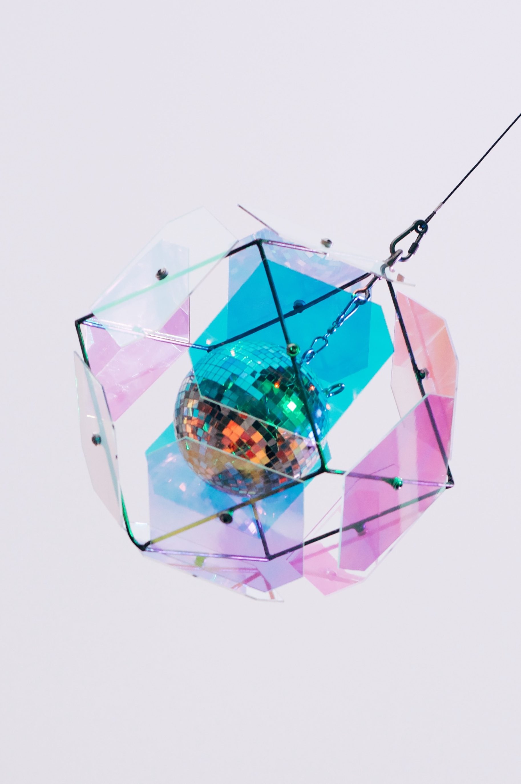 Etienne Gerat constructs illuminated suspensions that decompose light into color. A stainless steel structure supports complex geometric patterns of Acrylglas dichroic panels.
