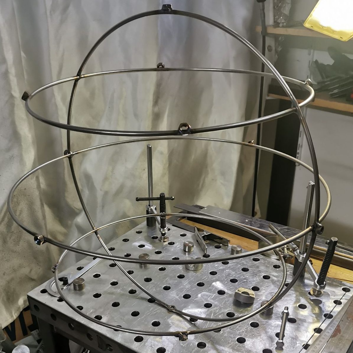 Welded rods of stainless steel assembled into geometric structures. Welded nuts support the faces.
